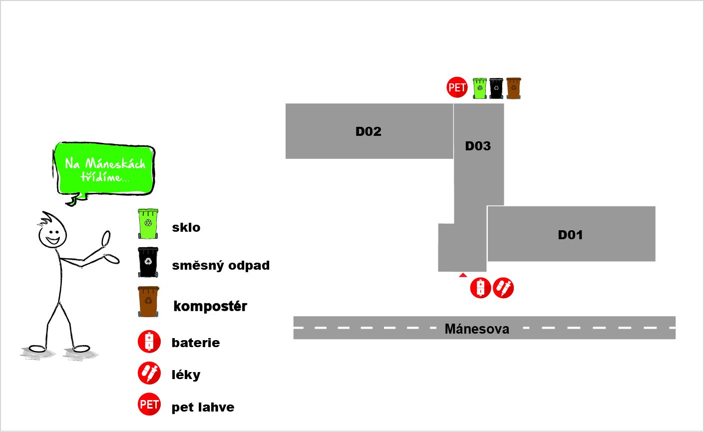 ☒ Odpad, který lze vytřídit pro recyklaci do jiných třídicích nádob. Nepatří sem ani léky, elektroodpad a nebezpečný odpad.